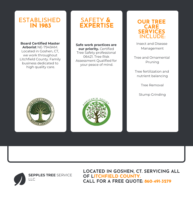Sepples Tree Services 195 Old Middle St, Goshen CT 06756. email: info@sepplestreeservices.com Tel: 860-491-3279